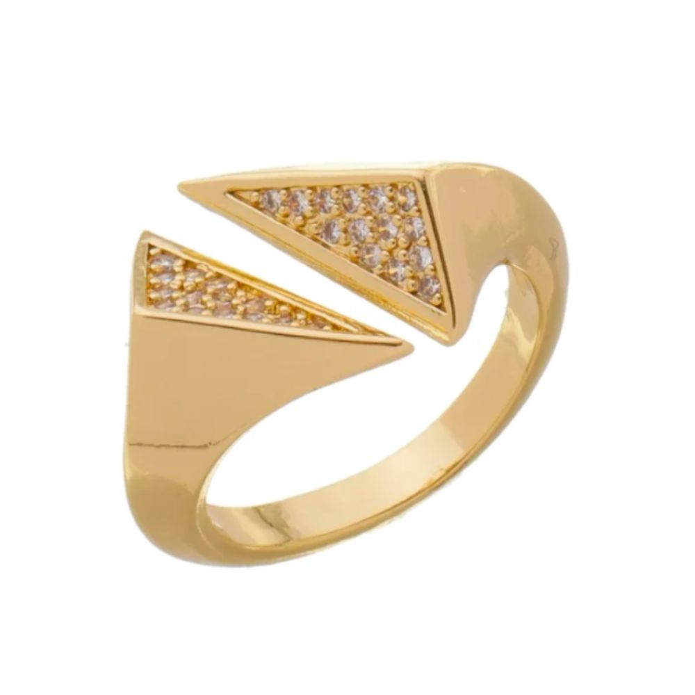 O Anel Ajustável de Triângulos Cravejados de Zircônias Banhado a Ouro é a união perfeita entre modernidade e brilho!