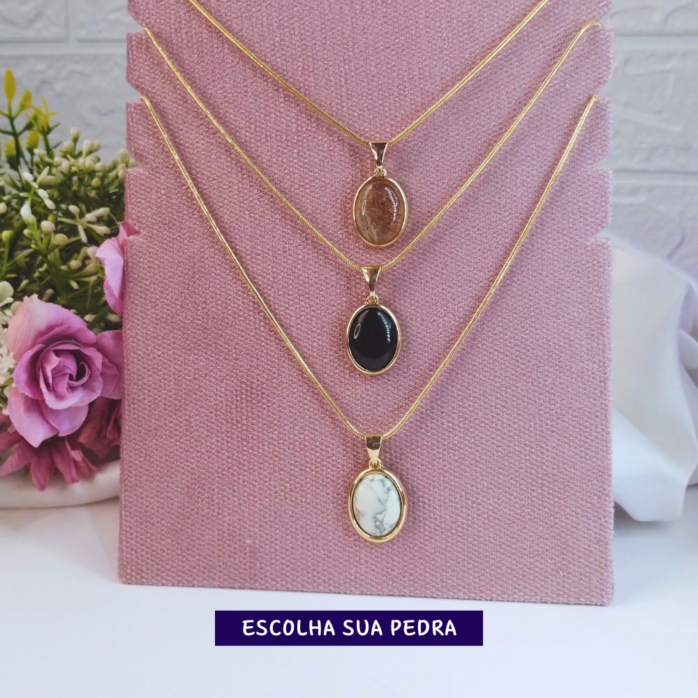 O design delicado da corrente destaca o pingente de pedra oval, que pode ser personalizado com a pedra de sua escolha, trazendo sofisticação e estilo único.