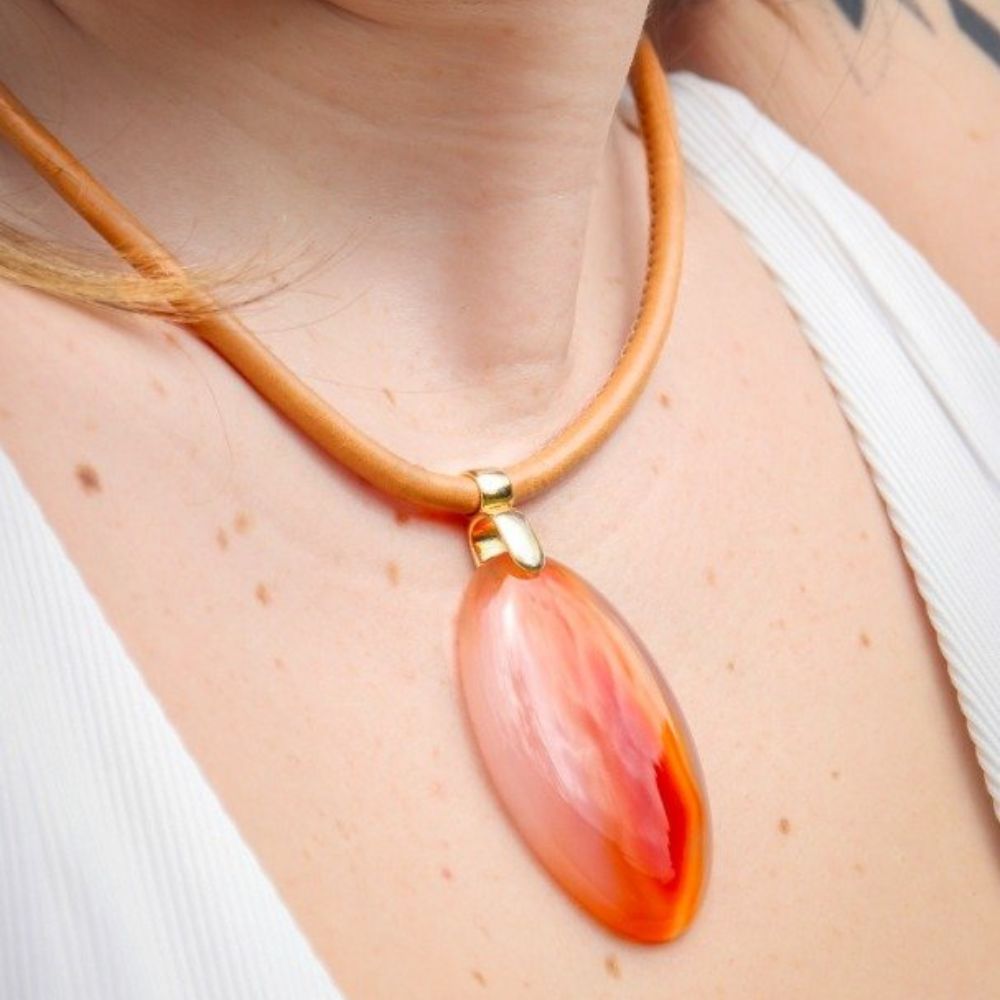 A Gargantilha de Courino Caramelo com pingente de Ágata Vermelha Banhado a Ouro é o acessório ideal para quem adora misturar modernidade e estilo boho.