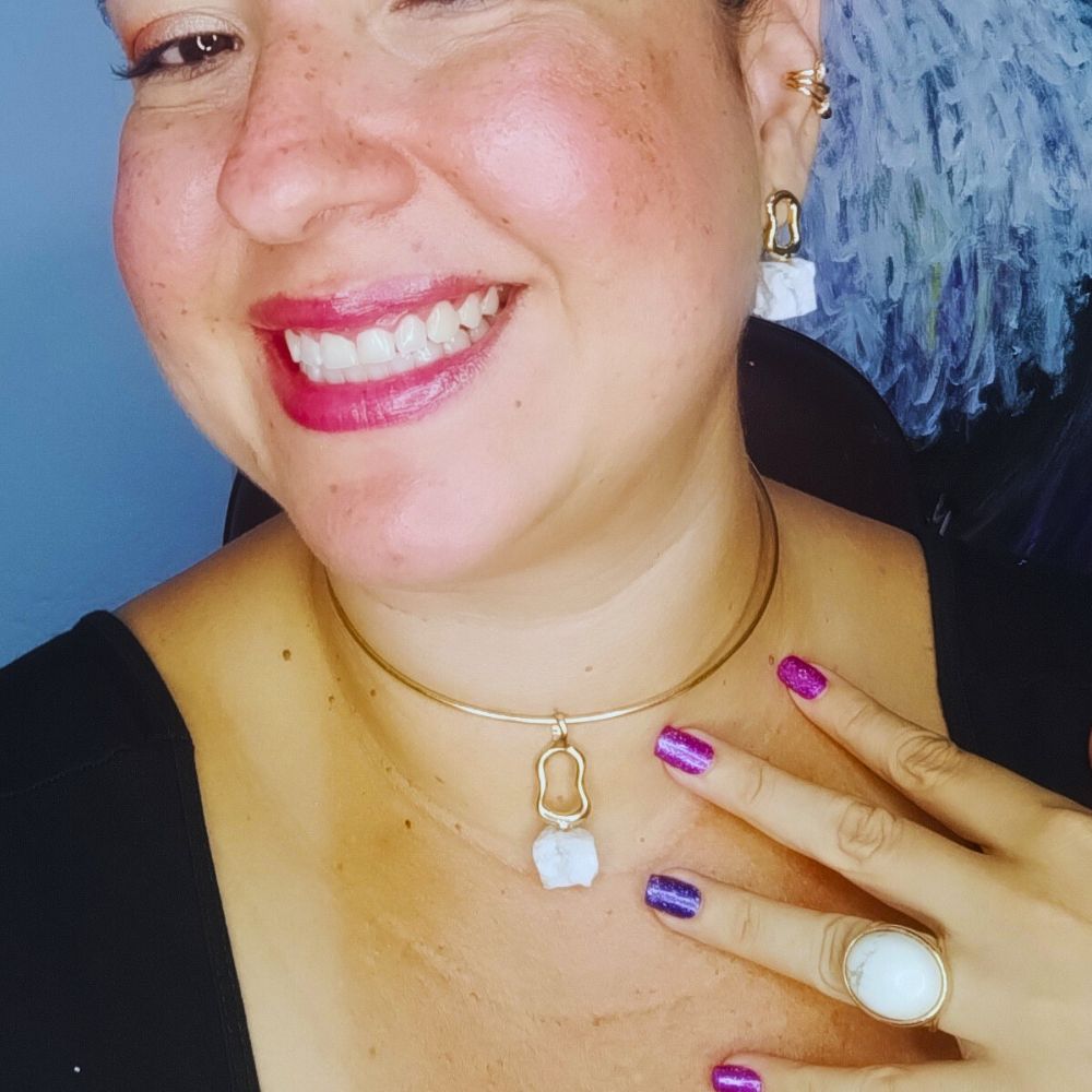 O Conjunto de Brincos e Gargantilha Aro com Pingente de Pedra Bruta Banhado a Ouro é para quem busca um estilo moderno com um toque de naturalidade.