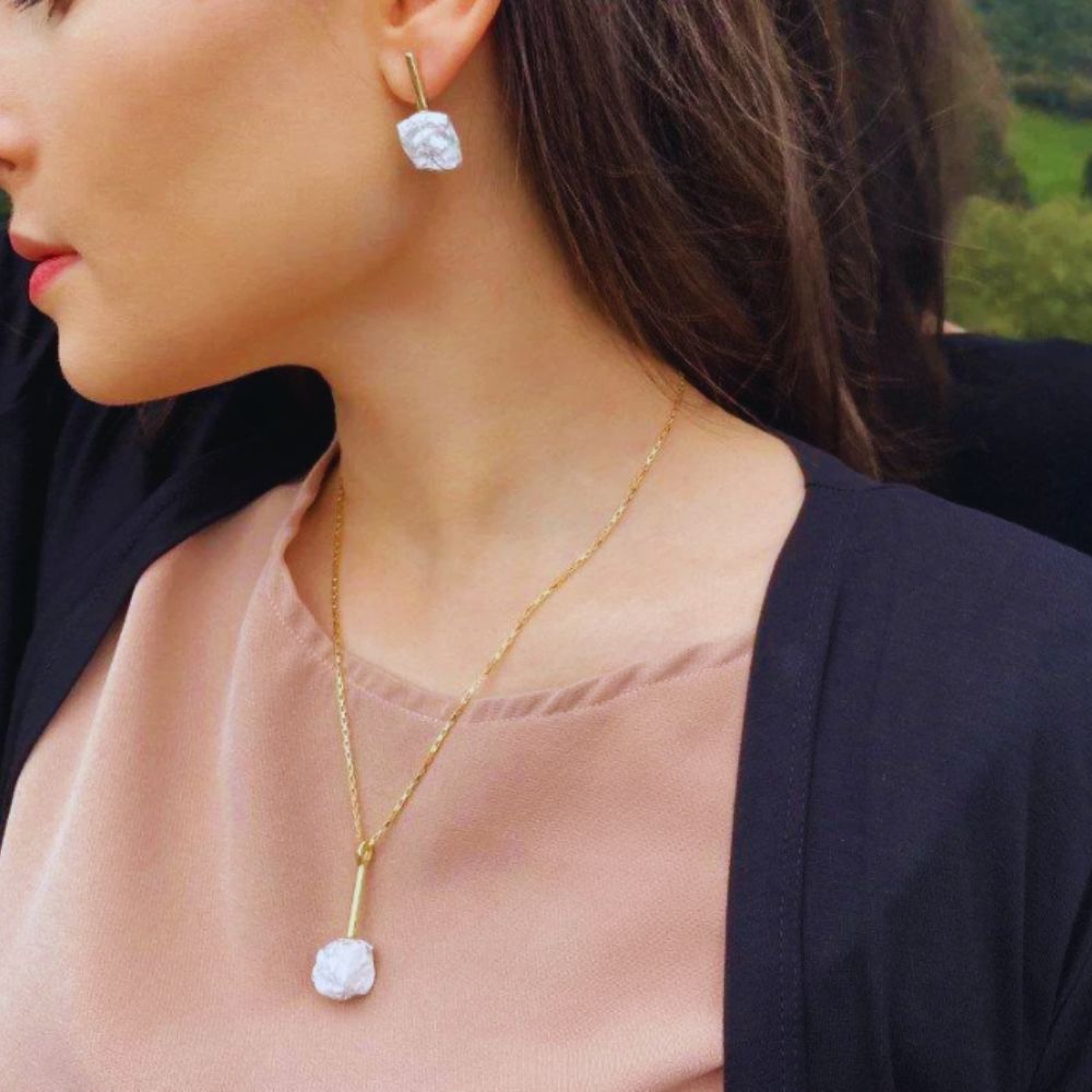 O design com pedra bruta traz um toque natural e único, já que cada peça carrega formas exclusivas, enquanto o banho em ouro adiciona sofisticação e brilho na medida certa. Ideal para quem ama acessórios autênticos e cheios de personalidade.