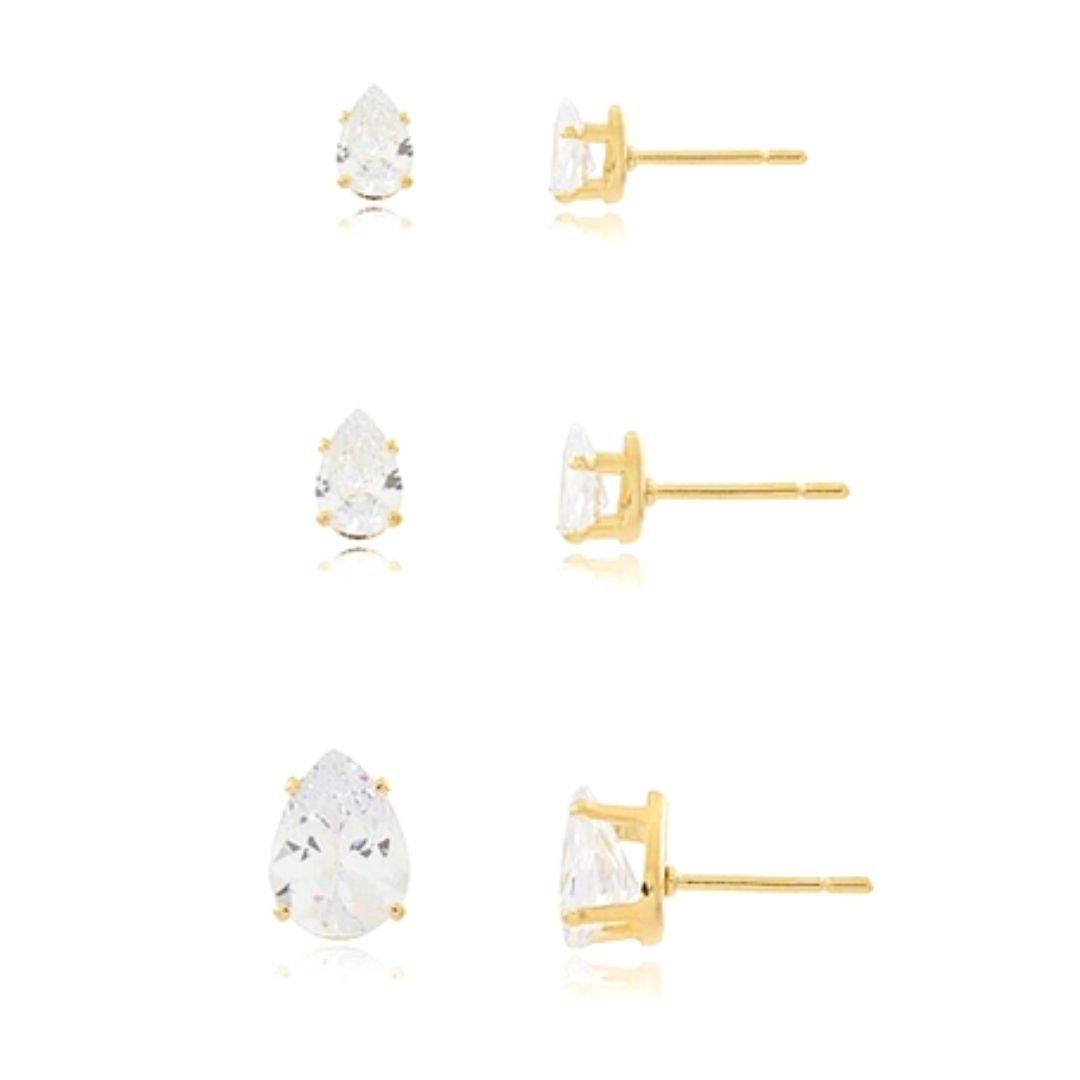 Trio Composto por brincos folheados a ouro 18k com zircônias de cristal no formato GOTA e possui três brincos em tamanhos crescente.